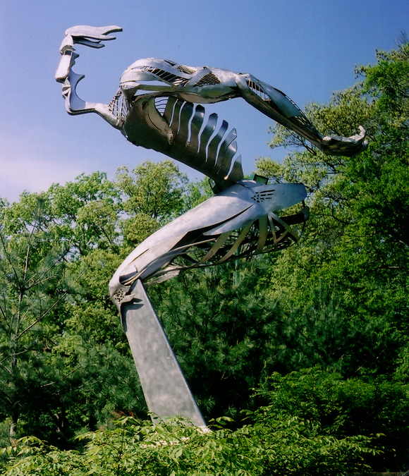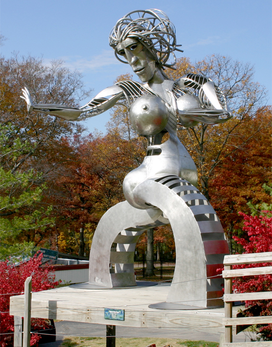 This sculpture is sixteen-feet in height and is constructed of stainless steel. It was my first attempt at building a figure of that height. I had previously built work at that monumental size, but they were commissions and took the form of tree-like sculptures which I created to meet the demands of the sites and budgets for which they were intended.
