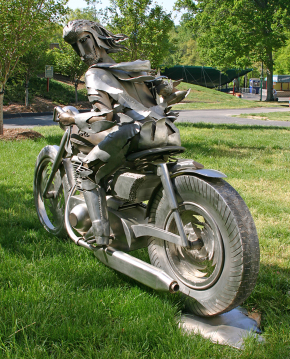 This work became one of the most complex sculptures I have sculpted as I have generally tended to increasingly eliminate parts of the figure in my work and simplify the form, but not as much with this one. It took me about three months to complete and is slightly larger than life-size. I actually started working on this piece at my studio in Washington, but finished it in Italy at the same time I was building Madre della Pace. I had completed the motorcycle, but not the figure, which I completed in the studio in Tuscany. It was also one of the pieces I showed at the Florence Biennale. Father Time is about nine feet long and six feet in height. At one show in Stamford, Connecticut it was placed in the center strip of the town and really looked like it was speeding down the road.