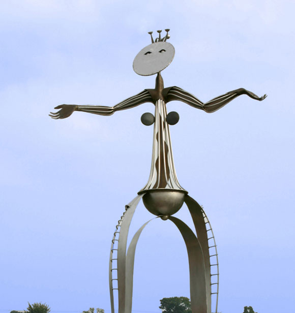 Receptor-Reflector was created rather spontaneously. It started off in one direction and then the main body of the work was turned upside down. It was then that I saw the figure with outstretched hands emerge in my mind. The outstretched arms refer to receiving energy and the flat stainless steel disc projects energy, especially when the sun strikes the plate.