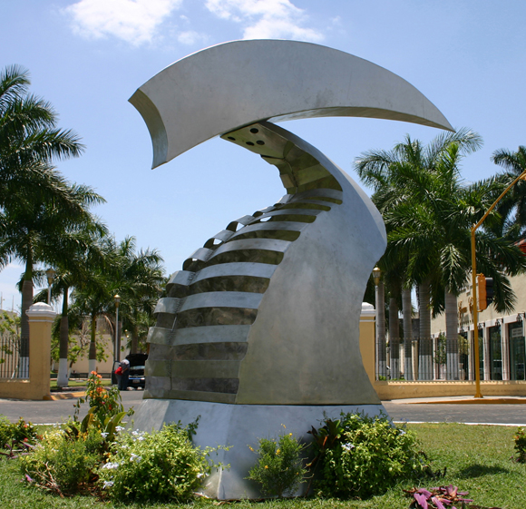 When I arrived in Merida, the installation crew had ripped the whole box apart and damaged some of the work. MACAY, had both the sculpture and the box repaired quickly by an excellent craftsman. My wife and I arrived in Merida for the opening, and were pleased to see how beautifully the organizers had placed the work in the center of the main city plaza.